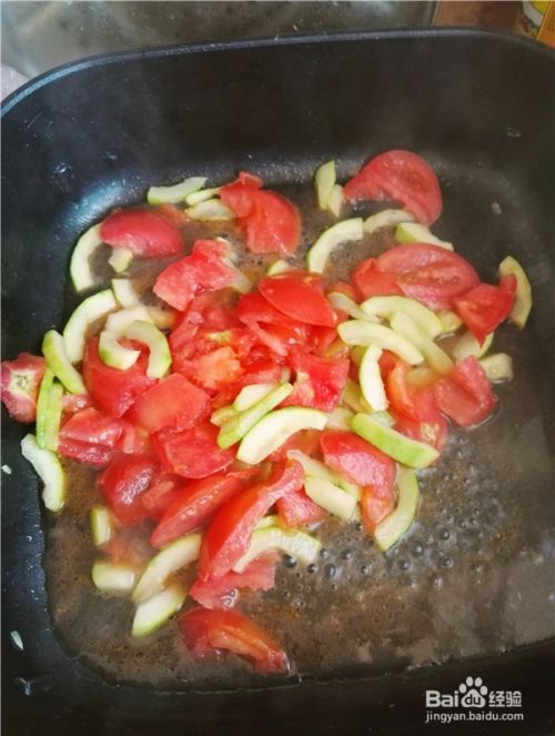 大约半分钟,等到飘出香气的时候,加入切好的西红柿,然后加适量盐,继续翻炒,中火或者中火以下,否则西红柿的汁会炒干。