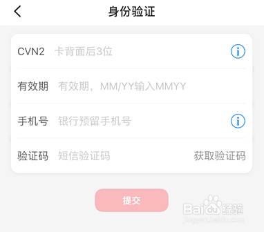 输入银行卡背面后三位数字以及正面的有效期;输入手机号以及验证码,点击【提交】