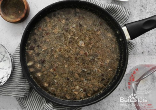 慢慢加入蘑菇肉汤。将混合物煮沸,然后文火煨。