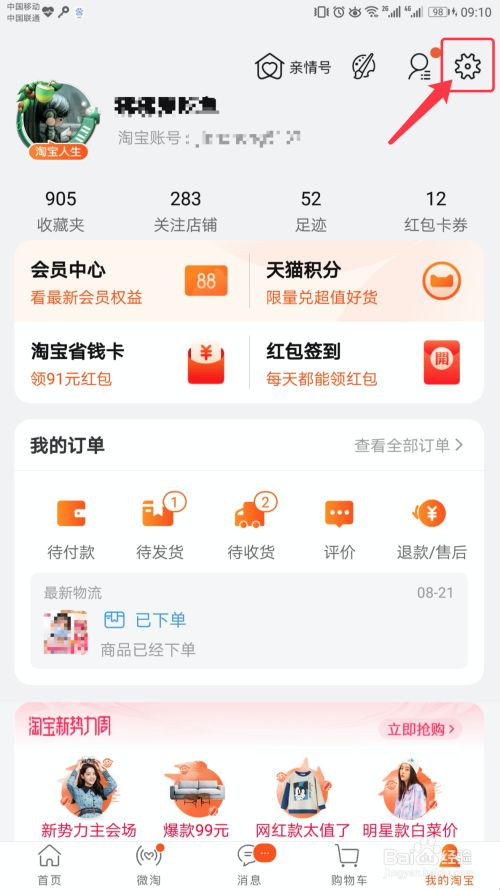 在【我的淘宝】页面,点击右上角的【设置】图标,如下图所示。