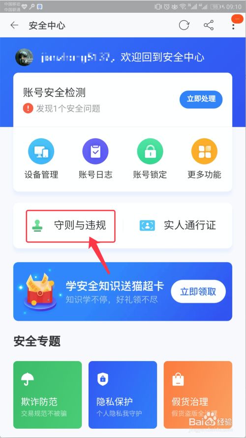 在【安全中心】页面,点击【守则与违规】图标,如下图所示。