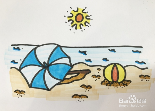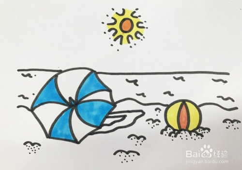 先在纸上画一个太阳伞和球,太阳伞斜放着,球的下面画上一些波浪线作为沙子。