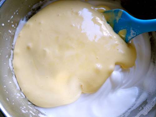 77、将三分之一蛋白霜加入蛋黄糊,切拌均匀。