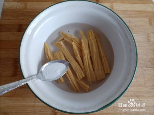 再给水里加入盐,这样腐竹会很容易泡发,而且软硬均匀。