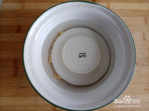 再用一个有点分量的盘子扣在盆里压住腐竹,这样可以让腐竹充分吸收水分,不会有的地方泡软了,而有的地方还是干硬的没泡上,这样大约浸泡3个小时即可。