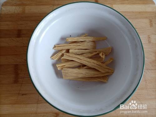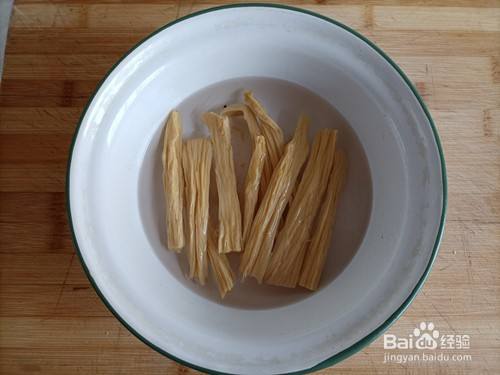 再给盆里倒入温水,水的量以没过腐竹为好。