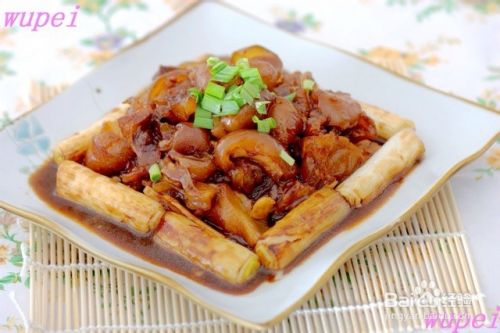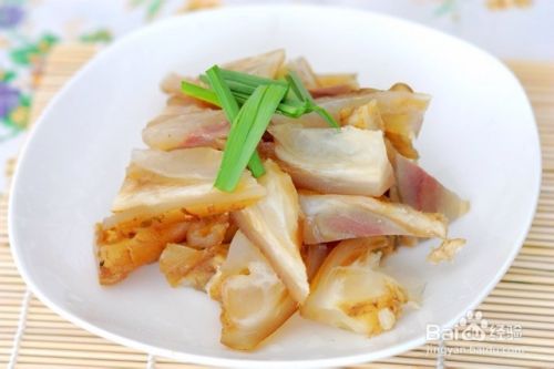 起锅:倒入花生油50克,热锅凉油:放入葱段煎至虎皮色,捞出摆盘待用,锅中放姜片,蒜瓣煸出香味,倒入蹄筋烹料酒,放耗油两勺,海鲜酱油一勺,白糖少许,进行煸抄,倒入开水两大勺中火烧五分钟,放冬笋片,煸抄一分钟,放青蒜,鸡精,水淀粉勾芡、淋入明油出锅装盘上桌。