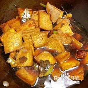 所有调料、豆腐块入锅,炒,加入老抽、生抽、料酒、味极鲜、蚝油,炒匀