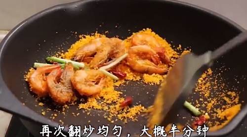 10倒入炸好的虾,加葱段、辣椒和椒盐,再次翻炒均匀,大概半分钟。