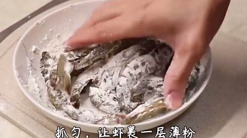 3处理好的虾,撒点面粉,抓匀,让虾裹一层薄粉。