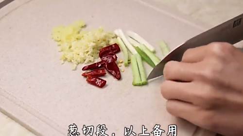 7蒜姜剁成末,干辣椒切段,葱切段备用。
