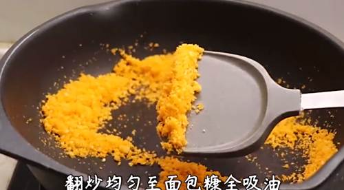 9保持中火,倒入面包糠,翻炒均匀至面包糠全吸油。