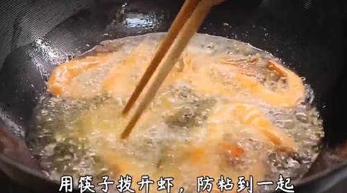 5虾快速入锅炸,用筷子拨开虾,防止粘在一起。