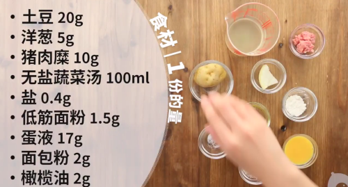 1首先准备食材,土豆20g,洋葱5g,猪肉糜10g,无盐蔬菜汤100ml,盐0.4g,低筋面粉1.5g,蛋液17g,面包粉2g,橄榄油2g。