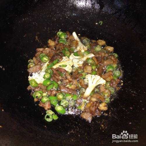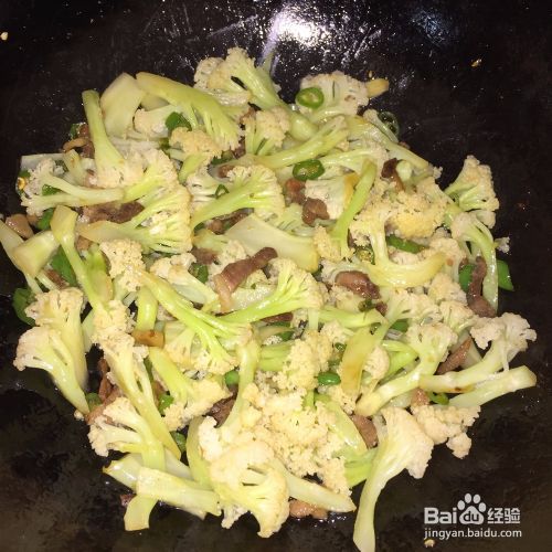 倒入花菜,放入少量盐,翻炒两分钟,就可以出锅啦。