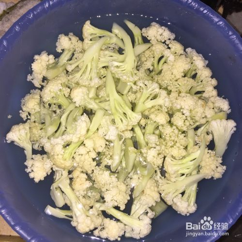 花菜切开,大小看个人爱好,不过要切得均匀,用盐水浸泡10-15分钟。