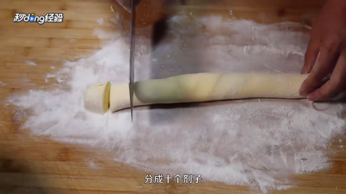 3取出面团放在案板上揉匀,分成十个剂子,整理成圆形。