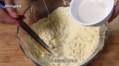 1把面粉和玉米粉混合,将酵母水缓缓带入面粉中,用筷子搅成絮状。