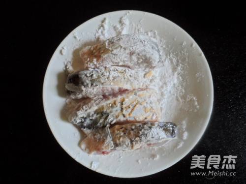 3碗内放入红薯淀粉,将鱼块粘上薄薄的红薯淀粉。