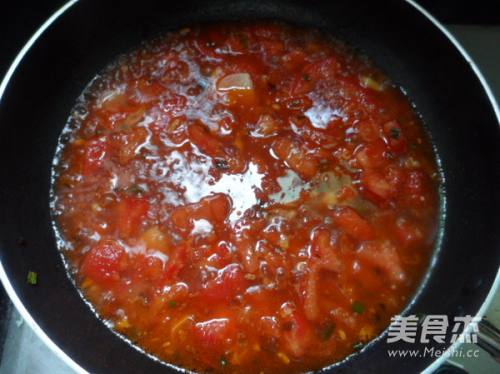 6再加入另外的番茄块及清水,用中火煮开后,转小火煮至蕃茄丁溶化。调入白糖,盐,鸡精、生抽。