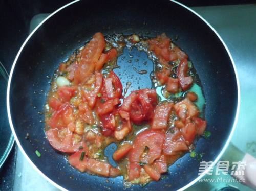 5续锅倒油,放入姜、蒜片、葱花炒香,再放入一半切碎的番茄丁、番茄酱,用小火煸炒一下。