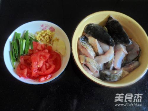 1草鱼洗净去净鳞,斩成长方块状。番茄切块,蒜切片,生姜切粒,香葱切段。