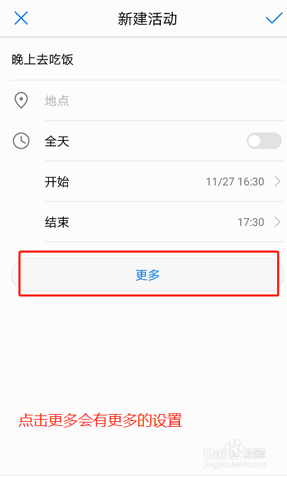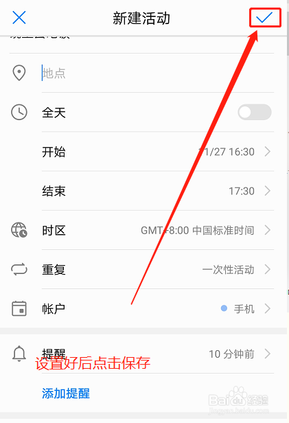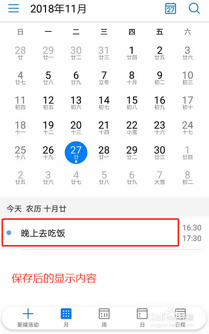 都设置完毕后点击又上角的保存,保存后会将此新建的活动在日历下方显示,在规定的时间就会有手机提示了。