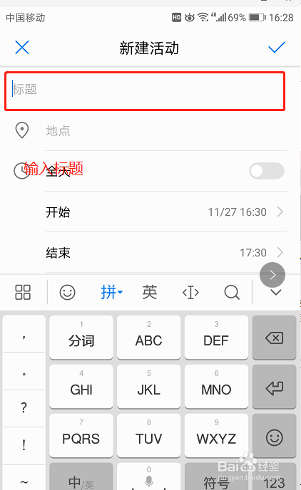 点击“新建活动”后在,会打开一个新的页面,会让我们添加一个比较醒目的标题,最好提炼精华,一看到标题就知道什么事情。