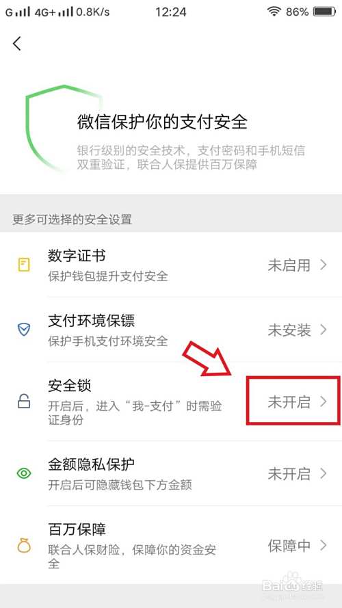 找到安全锁,现在是未开启的状态,点击”未开启“。