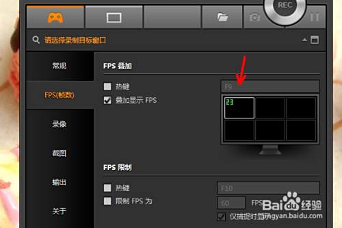 点击FPS帧数,默认叠加显示FPS并在录制的时候显示在左上角,我们可以在右侧的方格中点选显示的位置,需要的话下方有限制FPS的设置