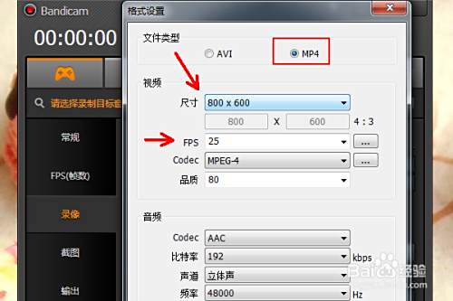 文件类型可以选择avi或者mp4两种类型,尺寸比如800*600,帧速率25等等