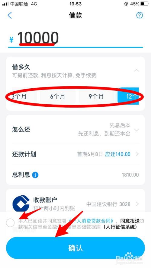 接下来,就可以输入你要借的钱数了。这里最少是三个月,最多是12个月,根据自身情况选完后,点击“确定”,就可以借到钱了,可以提现哦!