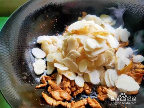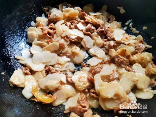先将腌制好的肉片倒入锅中,炒断生,加入切成薄片的马蹄,继续大火翻炒。