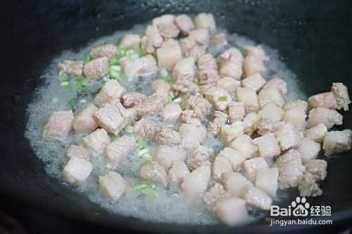 锅中热油,放入五花肉炸至变色后,放入葱段爆香。