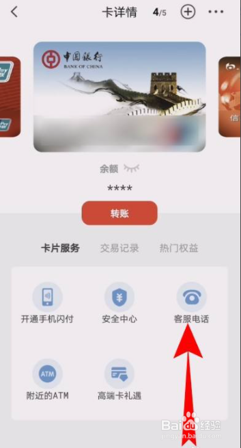 进入卡详情界面,选择需要查看的银行卡,点击客服电话。