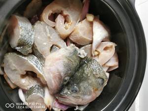 把腌制好的鲈鱼铺在洋葱上,放入啤酒半瓶,大火转小火,焖十五分钟