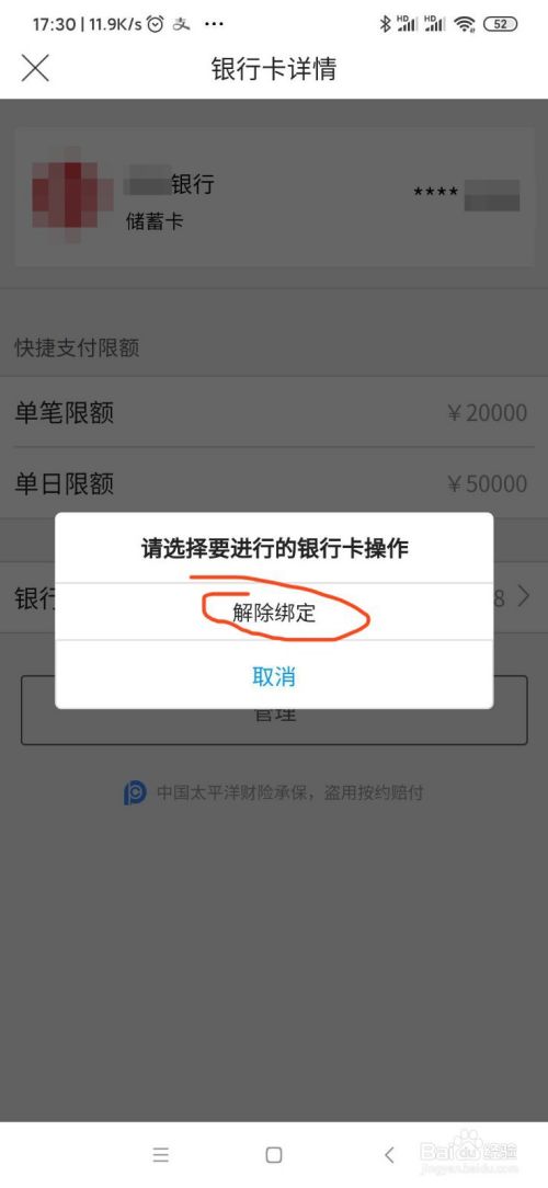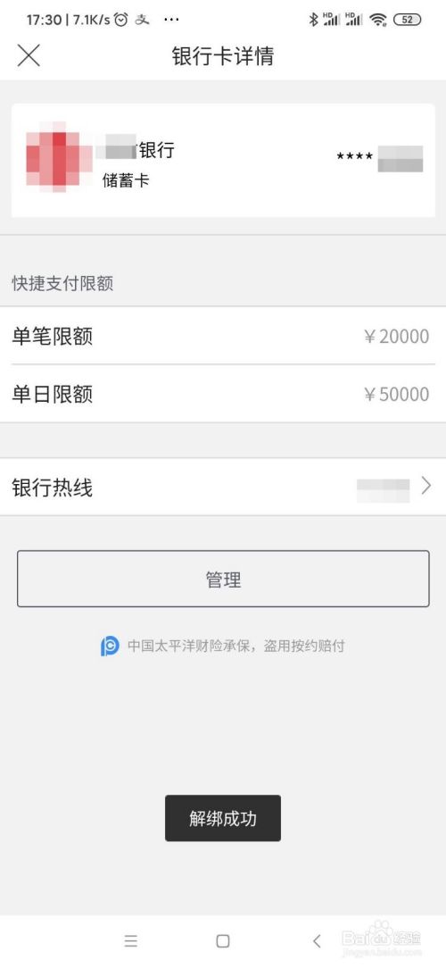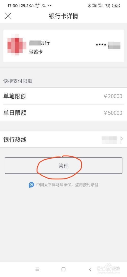 点击银行卡,进入银行卡信息页面,选择下方的管理。