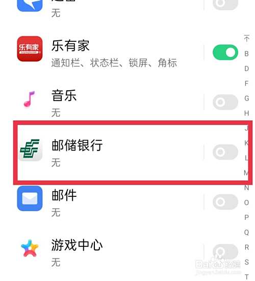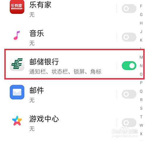 接下来,在目录里找到我们要设置的软件,观看它后面的“滑块”颜色,此时为绿色,代表已经打开了推送消息,我们只需要点击一下滑块就可以。
