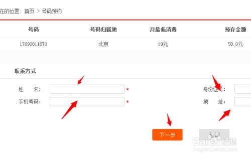 输入你的联系方式,包括手机号码、姓名、身份证号码,以及地址等信息,最后点击“下一步”按钮完成下一步操作,继续执行预约操作即可。