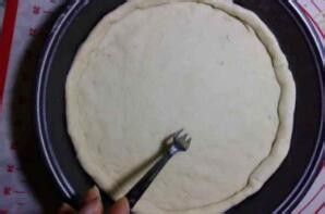 将其中一份擀成9寸的披萨盘大小,饼底用叉子扎些小眼(不扎也行。)并做出边子。按同样的方法做另十一寸烤盘饼底。