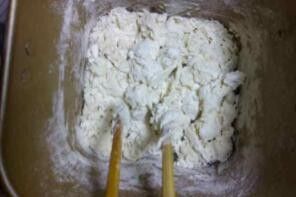 将280克的面粉加入2克的酵母放进面包机,加温水135,用筷子搅成无干粉状。