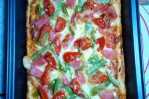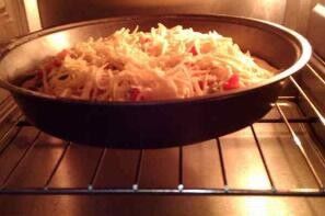 先抹上西红柿酱,撒上奶酪,火腿,西红柿,杏鲍茹。