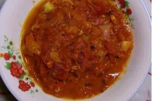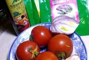西红柿酱料备齐,西红柿切块洋葱切小片,大蒜切片。