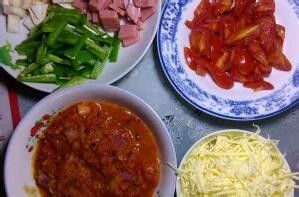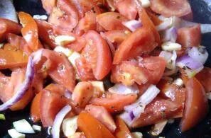 锅热放15克橄榄油,先放洋葱和大蒜,然后下西红柿,加盐,糖,披萨料和糖盐,中小火慢慢的将西红柿炒成酱。