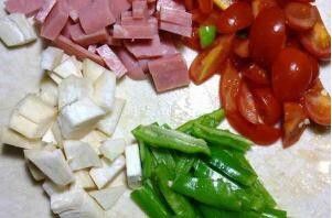 将杏鲍菇,火腿肠,洋葱,圣女果切成小块。(圣女果挤干水分)