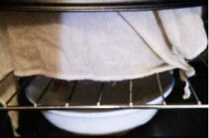 烤箱里放碗热水,面团放盆里包上保鲜膜外面盖上湿布,让其发酵。