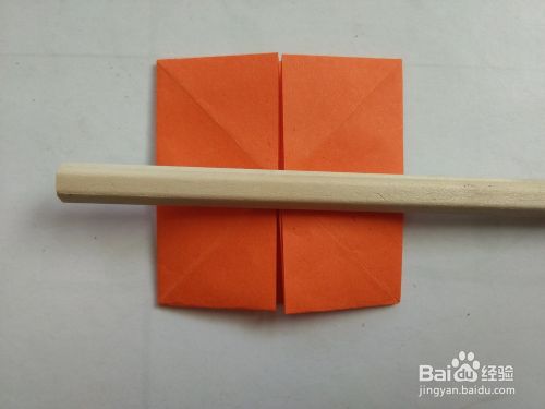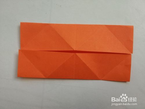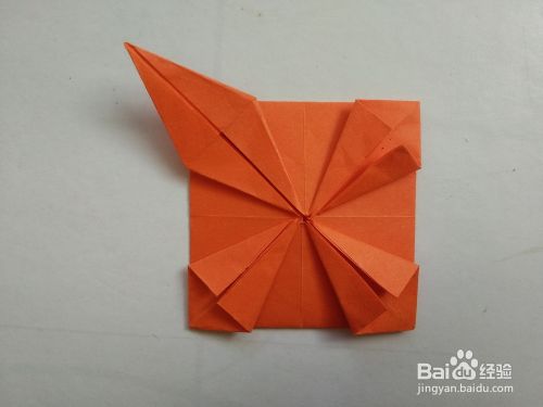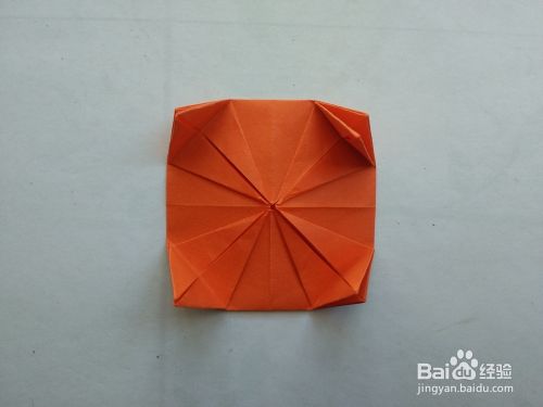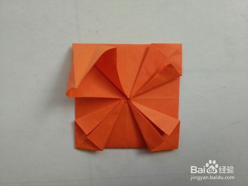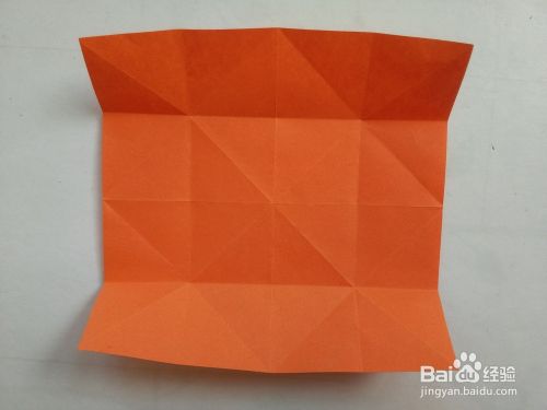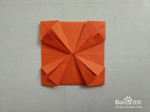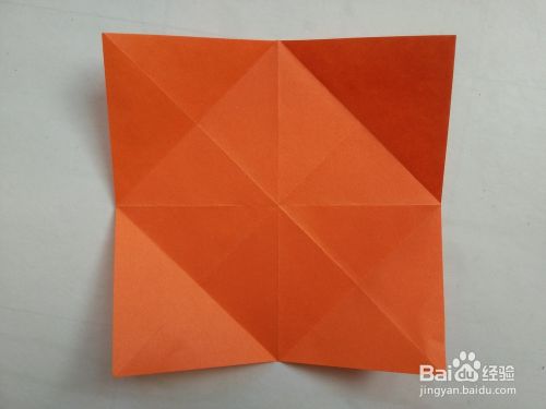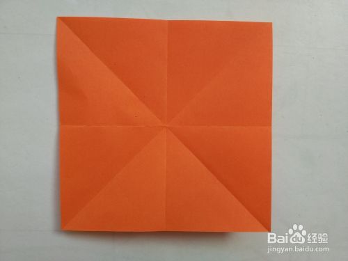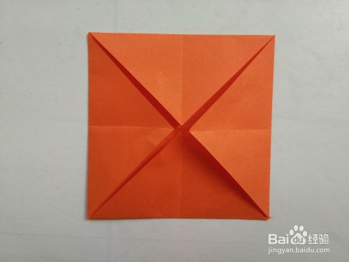 将正方形彩纸的四个角向中心点折,之后展开来。