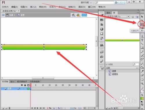 在第1帧与第100帧之间任意帧上右击,选择“创建补间形状”,我们在时间轴上可以看到一个箭头,“进度”元件就做好了。