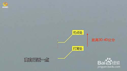 先在近处观察漂目,再抛满竿至钓点的远端观察漂目,如果两处漂目只有一两目的差距证明前后地势相对平坦。再抛至钓点左右两侧,如果漂目都相差不大就可以确定钓点一平方左右的位置相对平坦。这时打窝就可以打到钓点的正中位置。