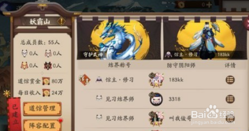 1、先要公会会长或副会长消耗1500个寮勋章创建道馆;2、委任一个道馆馆主和选择一头守护兽